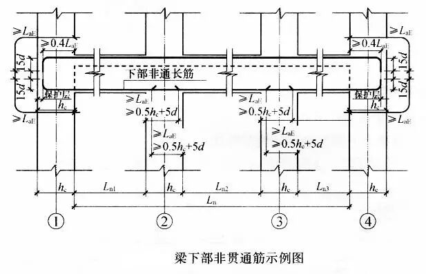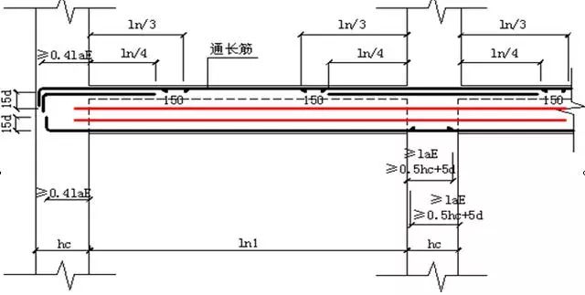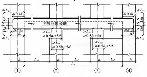 首尾跨下部非贯通筋长度=净跨Ln1(Ln3)+左右锚入支座内长度Max[(LaE),(0.5hc+5d)]