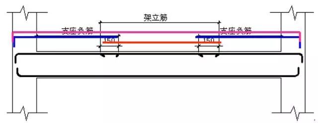 注:当梁的上部既有通长筋又有架立筋时,其中架立筋的搭接长度为150