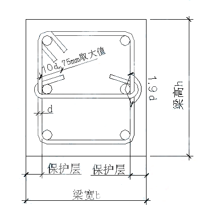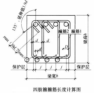 箍筋1长度=(梁宽b-保护层*2+d*2)*2+(梁高h-保护层*2+d*2)*2+1.9d*2+max(10d,75mm)*2